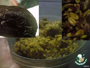 Орехи, у меня фисташки, измельчаем и смешиваем с сиропом, чтобы получилась однородная масса (мелкие орехи - фисташки или кедровые можно не измельчать, а просто полить сиропом и хорошо перемешать). Финики освобождаем от косточек и плодоножек и пропускаем через мясорубку (!!!!!) 2-3 раза. Не используйте блендеры и тому подобные штуки - могут сгореть!!!! (мой личный опыт, слава Богу, все осталось целым). У меня покупная паста.