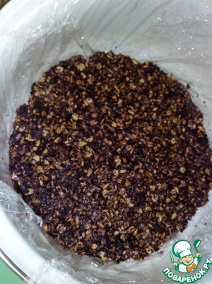 Хорошо перемешать и плотно утромбовать в форму, застеленную пищевой пленкой.