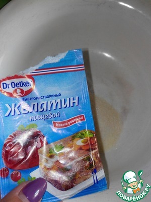 Для начинки желатин залить водой и приготовить по инструкции. У меня был быстрорастворимый, поэтому я просто сразу нагрела до полного растворения желатина, не доводя до кипения. Остужаем.