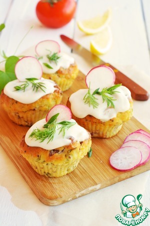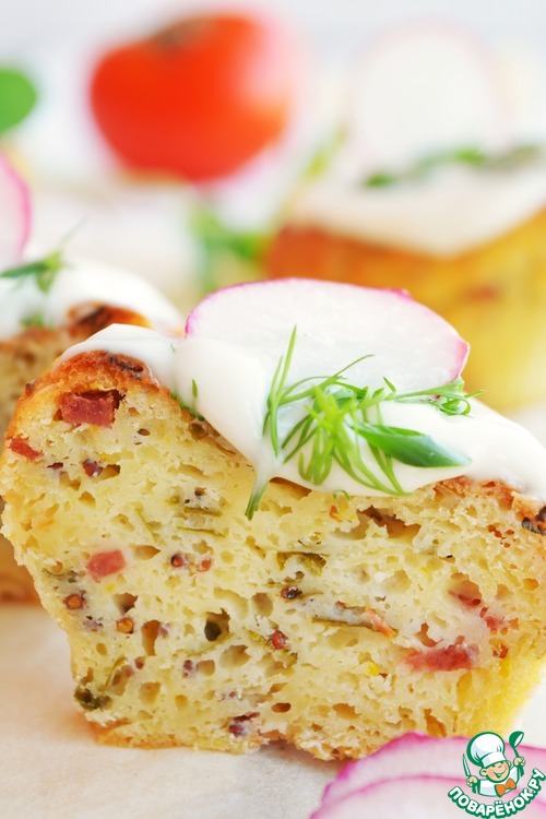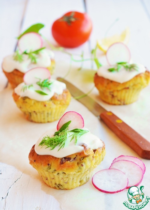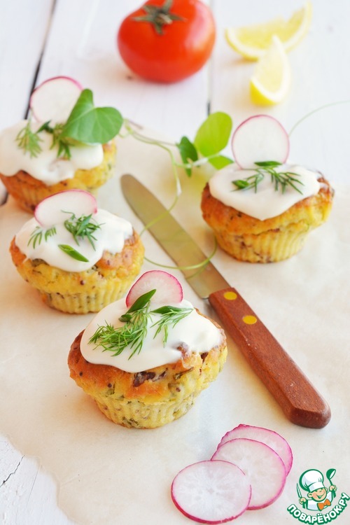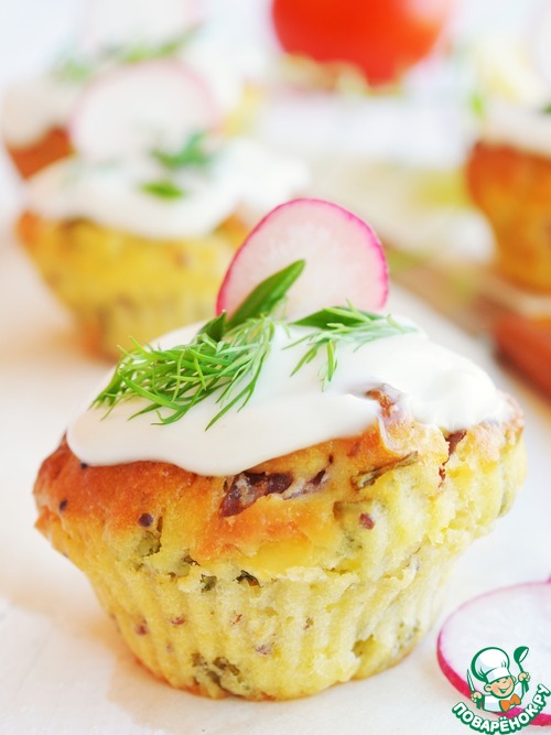 Для красоты я смазала верхушки майонезом и украсила зеленью и редисом. Если брать кексы на пикник - можно просто сложить их в контейнер, а майонез и зелень взять с собой по желанию.