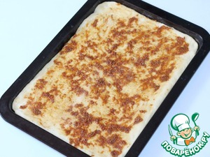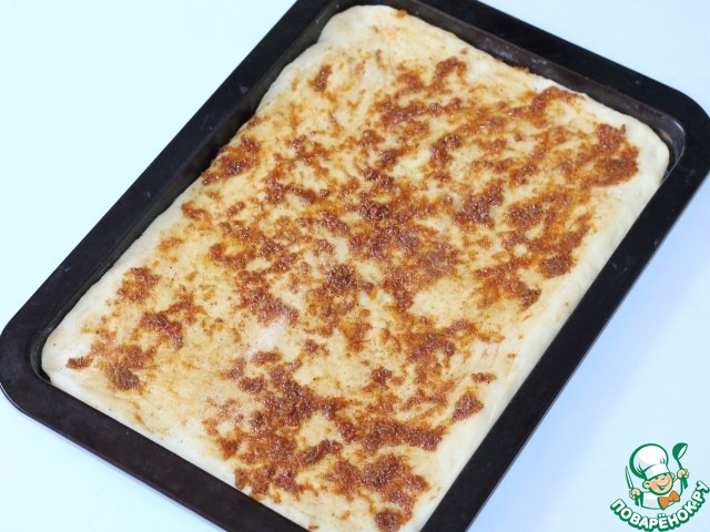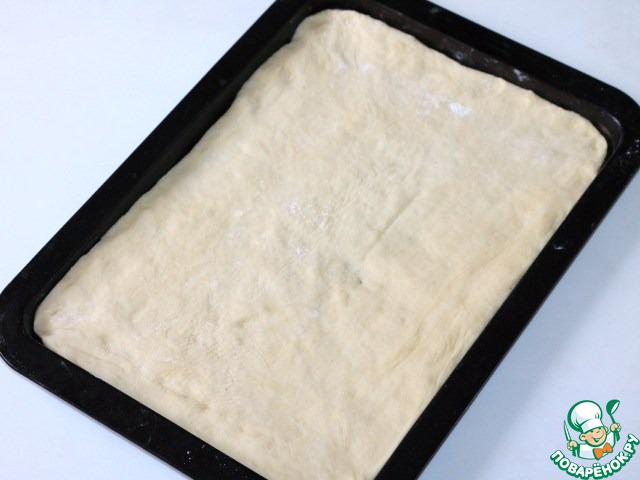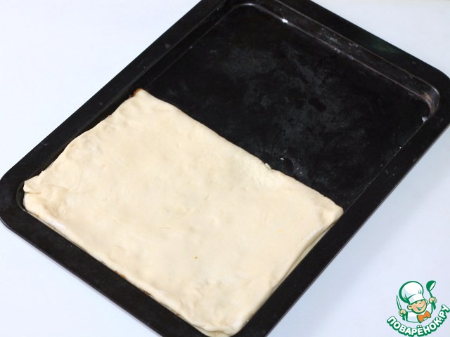 Немного припылите противень мукой и раскатайте тесто в прямоугольник. Не забывайте закрывать тесто сухим полотенцем, чтобы тесто не обветрилось, и не образовалась корочка. -