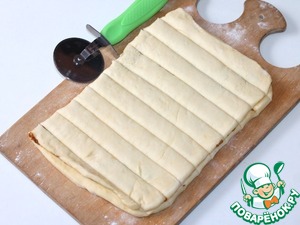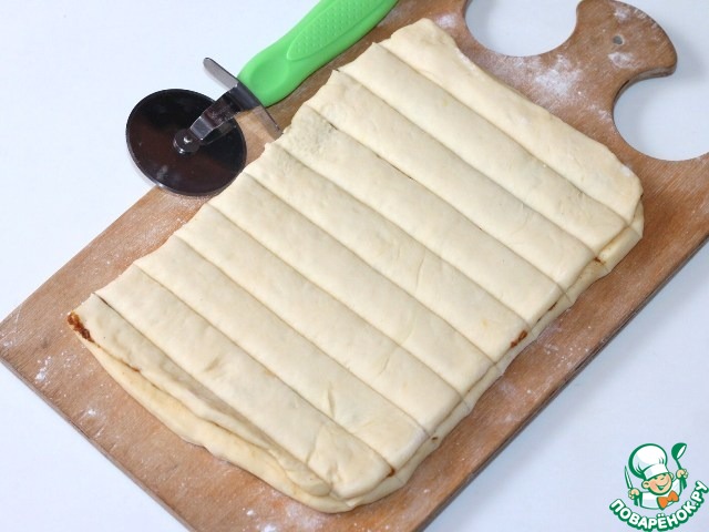 10. И нарежьте тесто около 2,5 см в ширину на полосы. Должно получиться около 10 полосок на одном противне.
