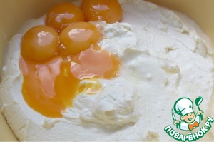 Добавить желтки и размешать деревянной ложкой или лопаткой.