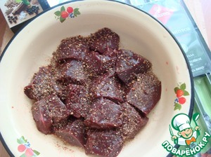 Присыпала куски специями для маринования мяса от FORESTER. Так как пакетик рассчитан на 3 кг мяса, то я на печень 500 г взяла 1 ст л специй. Перемешала в чашке и чуть присолила. Следуя указаниям на упаковке, я мариновала печень 15 минут.