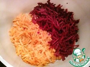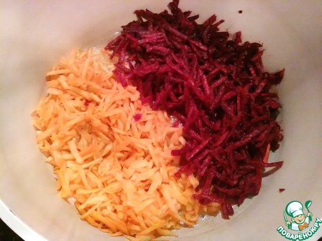 Натираем на терке и отправляем тушить в кастрюлю с маслом.