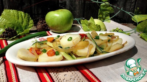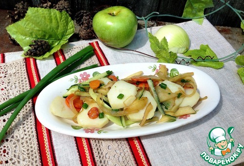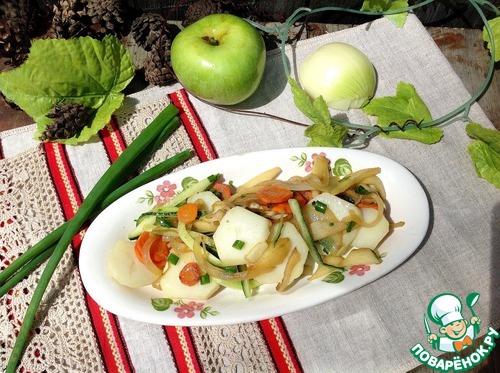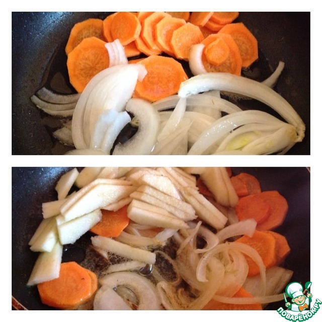 Лук нарезать полукольцами, морковь тонкими кружочками. Обжарить в небольшом количестве масла до зарумянивания. Яблоко очистить от семян и кожуры, нарезать соломкой и добавить к луку с морковью. Влить соевый соус и потушить все вместе не более 1,5-2 минут.