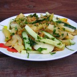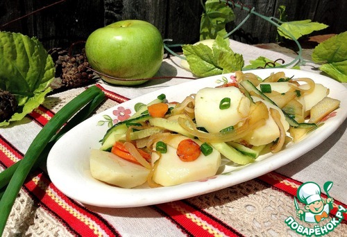 Картофель очистить от кожуры и нарезать кружочками. Зеленый лук измельчить, огурец нарезать соломкой. По необходимости добавить соль и молотый черный перец.