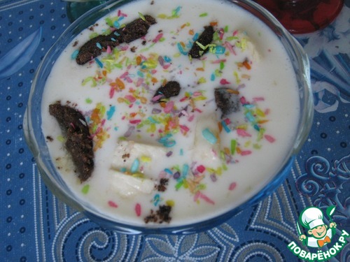 5. Начинаем делать десерт. Желатин ставим в микроволновку на 1,5-2 минуты, только чтоб не закипел. Смешиваем со сметаной. В креманки положить по несколько кусочков банана и апельсина, залить смесью из желатина и сметаны, но не до конца. Добавить пирожного несколько кусочков и залить смесью до конца креманки. Сверху посыпать цветной кокосовой стружкой, а можно заменить на тертый шоколад.