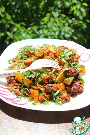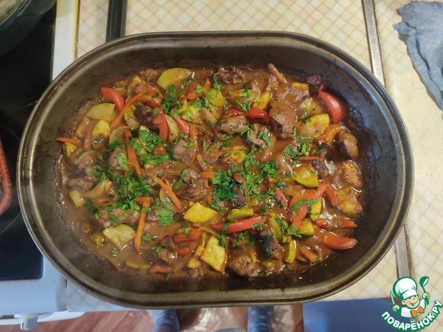 Я называю это блюдо "Два в одном" - в горячем виде это основное блюдо, а в холодном- прекрасная закуска! Вкусное, ароматное и красочное блюдо по мотивам болгарской кухни, но я добавила в него восточную нотку, не заморочитое, готовится все в одной посудине - и печень и овощи, минимум масла и максимум пользы - есть желающие? Тогда заходите, будем пробовать!