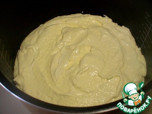 На дно чаши мультиварки уложить кружочек пергаментной бумаги, чашу маслом не смазывать, аккуратно перелить тесто, выставить режим «Выпечка» на 1 час.