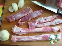 Режем мясо полосками см по 15-10 длиной и шириной см 3.
