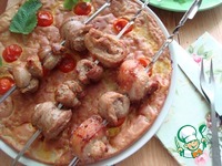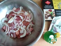 Шашлык из грудинки, замаринованный в приправе для мяса от FORESTER, с соком лайма, оливковым маслом и репчатым луком. Лук после я использовала для лепёшки овсяной на мацони с помидорками черри.