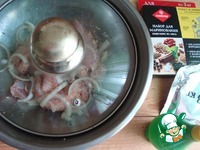 Мяса у меня 0,5 кг и я взяла приправы к нему 2 ст л. На низ посуды выложила приправу, потом 1 шт лука порезанного. Луковицы небольшие.