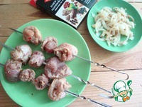 Нанизываем мясо на шампуры. Мясные полоски скручиваем рулетиками и протыкаем шампурами так, чтобы они не раскрутились. Остался лук и я его попробовала. До чего здорово промариновался и я с ним решила к шашлыкам испечь лепёшку овсяную. Шампуры несём на мангал и жарим шашлык. Это займёт минут 30. Всё зависит от жара и толщины рулетов свиных. Так как в мясе присутствует прослойка сала, то может в углях появиться огонь. Заливаем его просто водой.