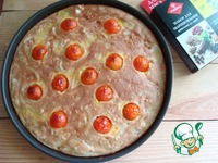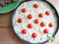 Взяла антипригарную форму и выложила тесто. Помидоры черри порезала пополам и разложила по лепёшке. Духовку разогрела до т-180 С и поставила лепёшку в неё на 20 минут. Ориентируйтесь по своей духовке. Пока делается в духовке лепёшка и пошла жарить шашлык.