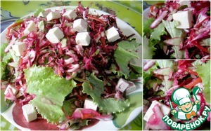 Приступаем к сборке :) На блюдо (или в миску) выложите часть листьев салата, на него - овощи, затем - кубики сыра. Повторяйте слои, выкладывая салат горкой. У меня получилось разделить все на 3 части.