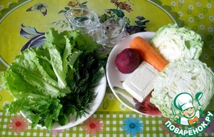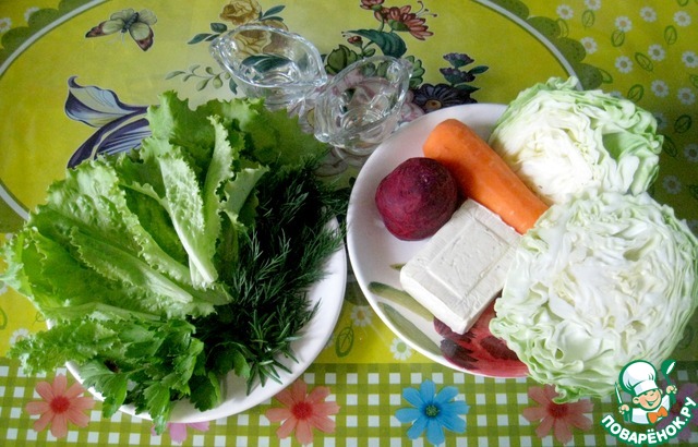Подготовьте ингредиенты: салат, капусту, зелень промойте, стряхните лишнюю воду, морковь и свеклу помойте и очистите от кожуры.