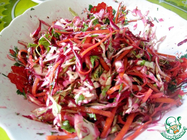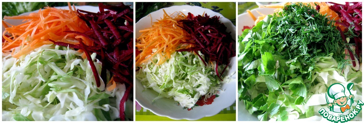 Капусту нашинкуйте, морковь и свеклу натрите на крупной терке или на терке для морковки по-корейски (так даже будет красивее). К сожалению такой теркой я до сих пор не обзавелась и попробовала натереть красиво на обычной :) Добавьте к овощам нарезанную мелко зелень. Берите ту, которая у вас есть. Я решила добавить еще немного свежего розмарина для большей свежести :)