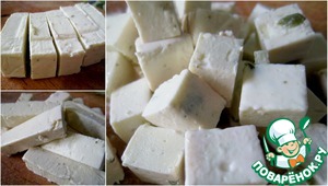 Плавленый сырок нарежьте кубиками (не мелко). Для того, чтобы аккуратно нарезать сырок, делайте это на влажной доске и смоченным в воде острым ножом. У меня сырок со вкусом "Тартар", но вы можете взять свой любимый.