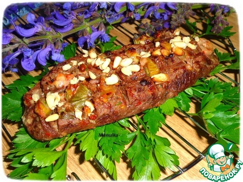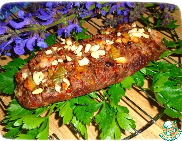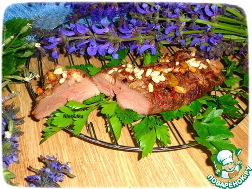 Готовое мясо убираем с решетки-гриль и посыпаем сверху слегка поджаренными кедровыми орешками.