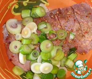 Порезать кружочками молодой чеснок и добавить к мясу.