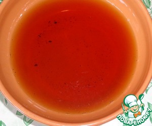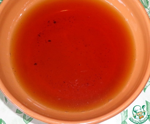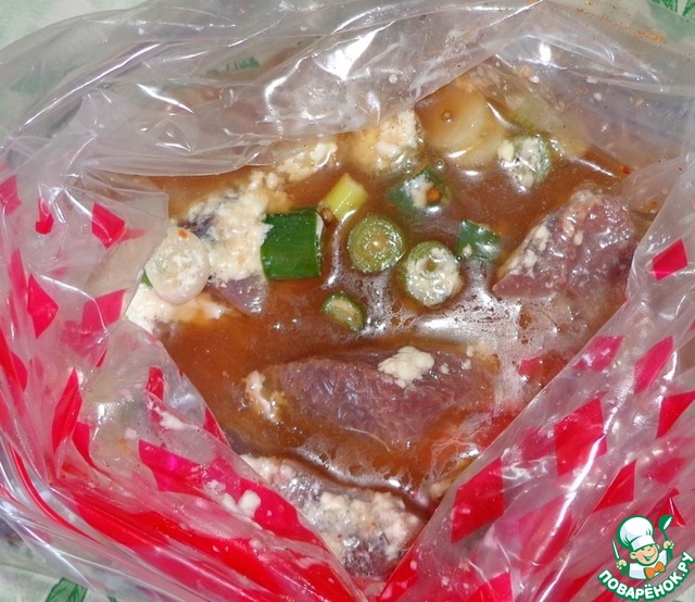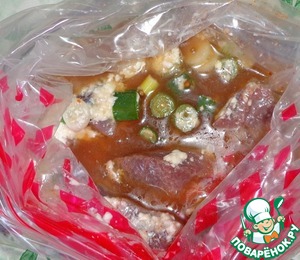 Перекладываем мясо в пакет для маринования от компании Forester, который прилагается к приправе, что очень удобно. Можно сразу мариновать в пакете. Залить чайной заваркой (комнатная температура). Мариновать около 3 часов.