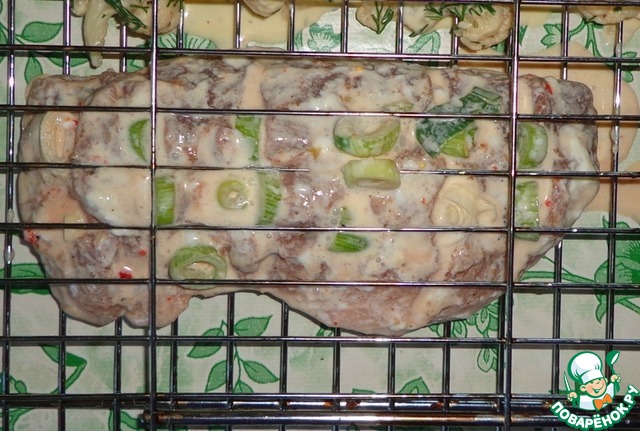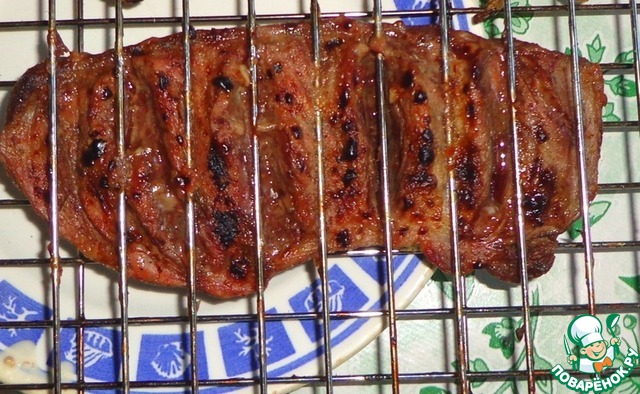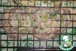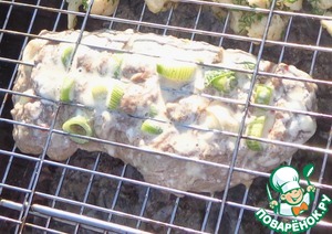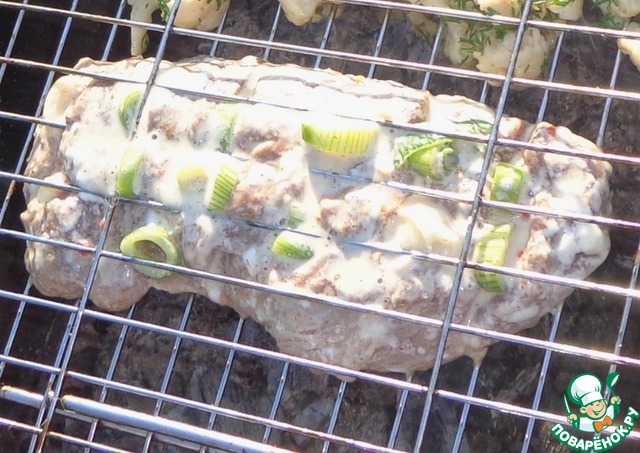 Мясо достать из маринада и заполнить надрезы молодым чесноком (из маринада). Мясо кладем на решетку-гриль, закрываем решетку-гриль и несем на мангал.