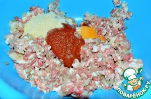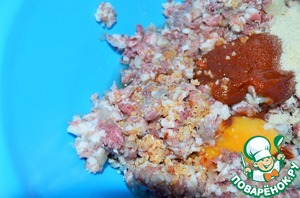 В мясо добавить желток (белок делает котлеты плотными, более грубыми), томатный соус (это, наверное, самый необычный ингредиент в фарше, но он необходим. Придаст сочность, некую пикантность и окрасит в более интенсивный цвет), панировочные сухари.