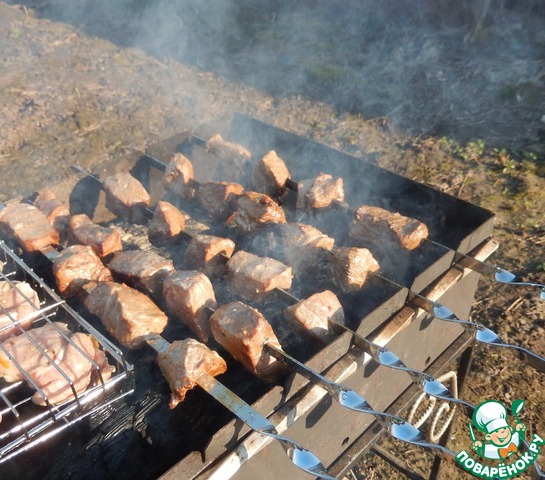 Жарим мясо до готовности следим за тем чтобы не пересушить. Большие шампуры отлично вписались в родительский мангал не малых габаритов. Их очень удобно переворачивать на любую сторону они не съезжают и хорошо держаться. А отмываются после всего этого вообще великолепно.