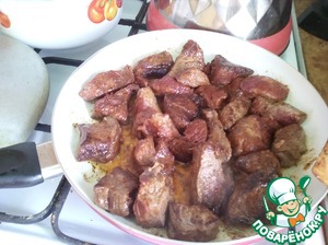 Затем обжариваем мясо на смеси сливочного и растительного масла, по 2 минуты с каждой стороны. После обжарки мясо отправляем в кастрюлю для тушения.