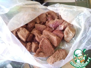 Говядину моем, обсушиваем, режем произвольными кусочками. Панируем в смеси паприки, черного перца и муки. Лучше всего это делать в пакете-так панировка распределится равномерно на каждый кусочек.