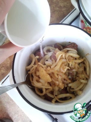 Добавляем к мясу с луком 180 мл. кипятка, ставим на маленький огонь.