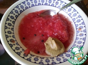 Тем временем готовим заправку: помидор натираем на терке (шкурку выбрасываем), добавляем столовую ложку сахара, 5 горошин чёрного перца, горчицу, перемешиваем. Вливаем заправку в кастрюлю с мясом. Оставляем минут на 35-40.