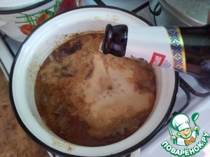 Через 35-40 минут добавляем к кипящему мясу 250 мл. светлого пива, оставляем тушиться ещё минут на 40.