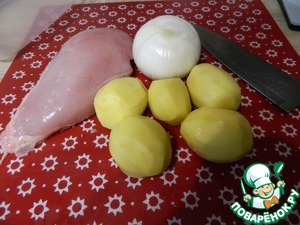 Для сытной начинки берем: куриную грудку, картофель, лук и специи.