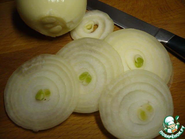 Репчатый лук очистить, промыть, нарезать кольцами или полукольцами.