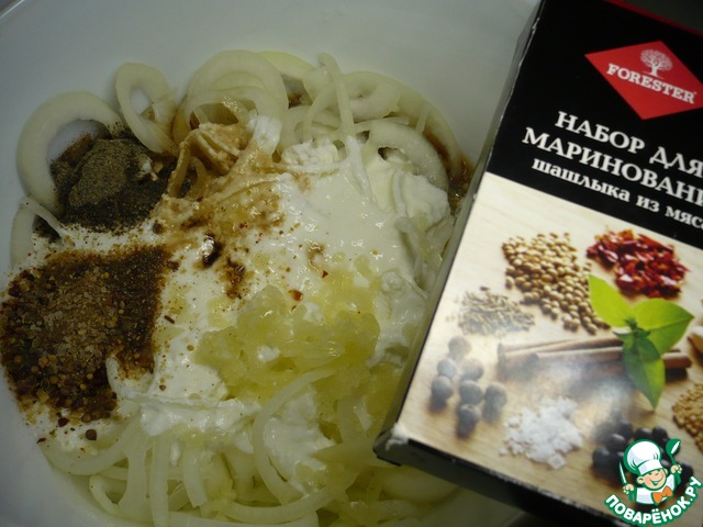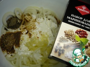 Теперь готовим маринад: выложить нарезанный лук в кастрюлю, немного помять, так, чтобы он пустил сок, добавить кефир, влить соевый соус, очищенные зубки чеснока выдавить в маринад через пресс, добавить приправу для шашлыка из мяса "FORESTER", перец по вкусу. Хорошо перемешать.