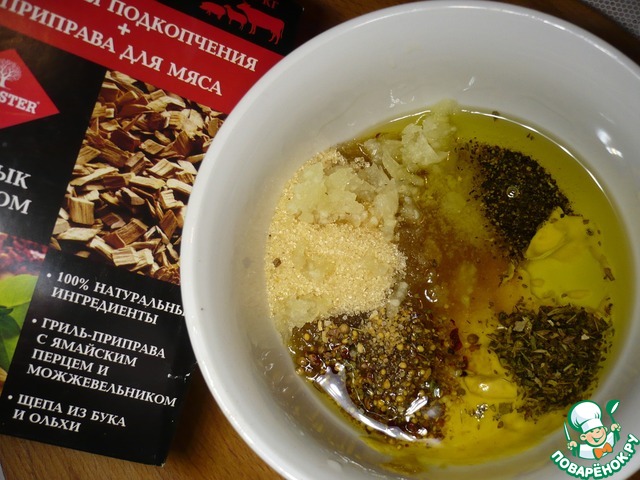 Приготовим маринад: измельчить чеснок, добавить горчицу, коричневый сахар, черный молотый перец, соль и приправу для мяса от "FORESTER" (с ямайским перцем и можжевельником), масло оливковое.