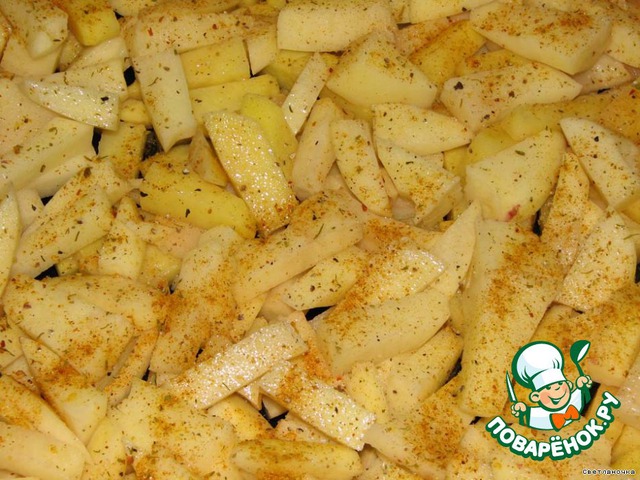 7. На смазанный маслом противень укладываем порезанный брусочками картофель. Солим, посыпаем свежемолотым перцем, приправой «Для картофеля». Добавляем немного воды.