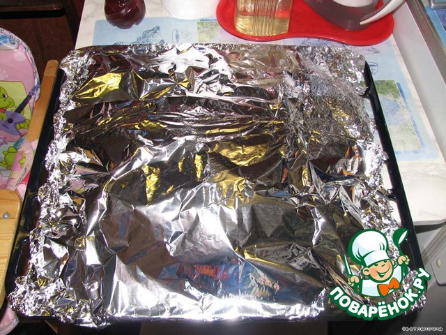 11. Накрываем противень фольгой и ставим в разогретую до 250° духовку на 10 минут, затем убавляем мощность до 200° и выдерживаем курочку ещё 40 минут.
