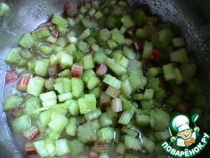 Для соуса ревень, вымыть, очистить, нарезать небольшими кусочками, подсыпать сахар, дать постоять 1 час, затем подлить воду, довести до кипения и готовить, помешивая 10- 15 мин, на маленьком огне.