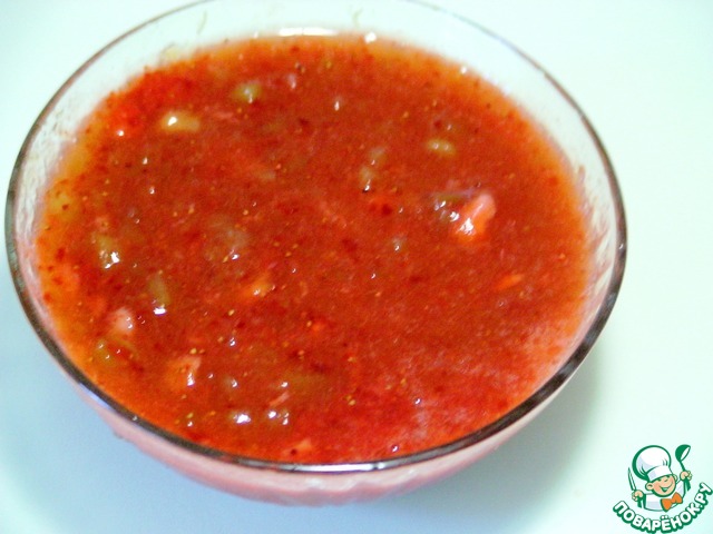 Снять с огня, пробить в блендере, вернуть на плиту, проварить 2 минуты. Клубнику пробить в блендере, соединить с ревенем.