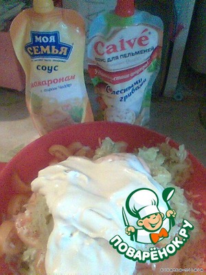 Добавить майонез (я для пикантности еще добавила "Calve. Соус для пельменей с лесными грибами" и "Моя СЕМЬЯ. Соус к макаронам с сыром Чеддер" ;-)).