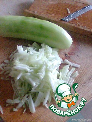 Огурец помыть, натереть на терке (я удалила предварительно у огурца кожицу, т. к. у меня ее не любят, но можно этого не делать :-)).