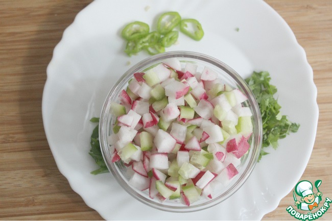 Порезать перец чили колечками, редис и огурец мелким кубиком, чеснок пластинками.