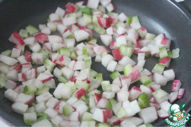 Обжарить на разогретой сковороде с 1 ст. л оливкового масла чили, чеснок с редисом и огурцом, мешая пару минут.