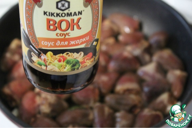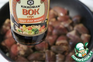 Сердечки отцедить от маринада и обжарить на оставшемся оливковом масле на сильном огне - когда в сковороде будет много сока от сердечек - слить его и сковороду вернуть на огонь, добавить соус Киккоман Вок, перец черный и довести до готовности под крышкой практически до полного испарения жидкости - на среднем огне.