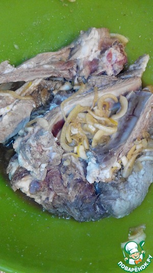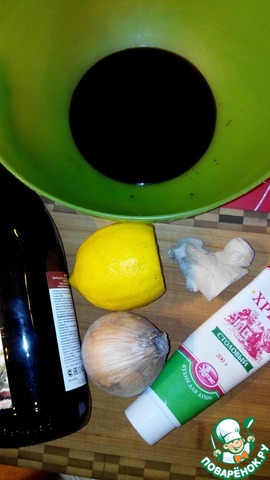 Для маринада смешать соевый соус, вино, цедру лимона, натертый имбирь, готовый хрен, нарезанный кольцами лук и измельченный чеснок