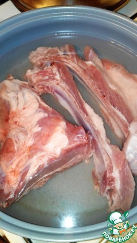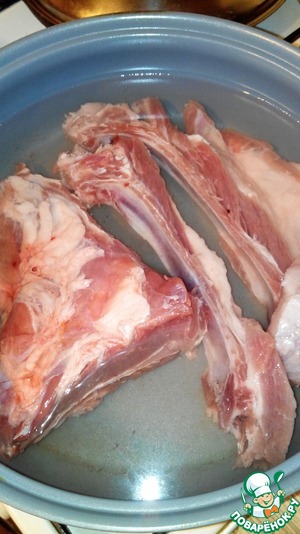 Ребра нарезать и поместить в кастрюлю с холодной водой. Дать закипеть и варить 15 минут