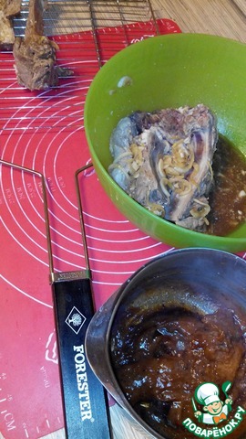 Выложить ребра из маринада на решетку-гриль, Обмазать их подливкой.